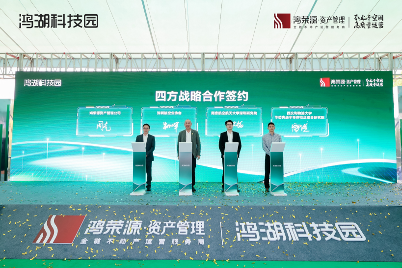会上,鸿荣源资产管理公司与深圳航空业协会、南京航空航天大学深圳研究院、西交利物浦大学-华芯先进半导体校企联合研究院联合签署战略合作协议,构建产学研科技成果转化枢纽;