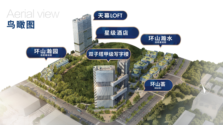 INPARK星贸中心引入新加坡花园城市规划理念,因地制宜围绕环山岭公园布局,建筑依山势层层错落、交融共生。规划有双子塔甲级写字楼、低密度联排/叠拼(北麓、南麓)、星级酒店、商业及天幕LOFT五大业态,建筑与山体参差错落,交融共生,形成创享、办公、慢行、购物、生活等五大场景,实现办公、商务、生活融于一体的五维超级剧场。