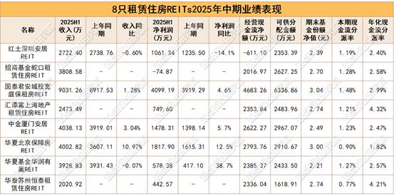 8月底,已上市的8只租赁住房REITs先后披露了2025年中期业绩报告,整体延续运营稳定、出租率维持高位、分派继续落实等特征。