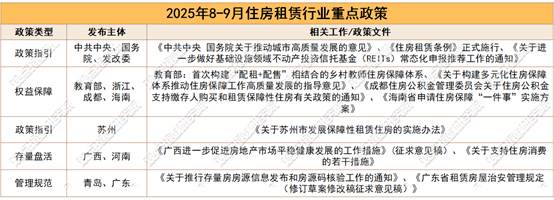 回顾期内政策,据观点指数不完全统计,2025年8-9月中央及地方层面政策文件/工作会议聚焦政策指引、权益保障、规范管理、存量盘活等维度的推进,政策覆盖租赁市场的供给、需求、交易全链条,有效优化住房租赁市场的供需结构,提升市场规范化与专业化水平,为行业从规模扩张到高质量发展注入强劲动力。
