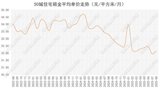 2025年8月,50城住宅平均租金单价为31.94元/平方米/月,环比由跌转涨,涨幅为0.59%,主要是由于8月正值高校毕业生入职季尾声,核心城市刚需租赁需求仍有释放,叠加部分区域新增房源入市节奏放缓,供需关系边际改善推动租金止跌。