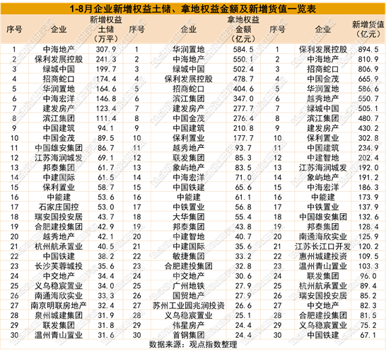 从权益拿地金额来看,1-8月土地投资力度最大的企业为华润置地、中海地产、绿城中国、保利发展控股、招商蛇口,权益拓储金额分别为584.5亿元、550.1亿元、502.4亿元、478.7亿元、404.6亿元。
