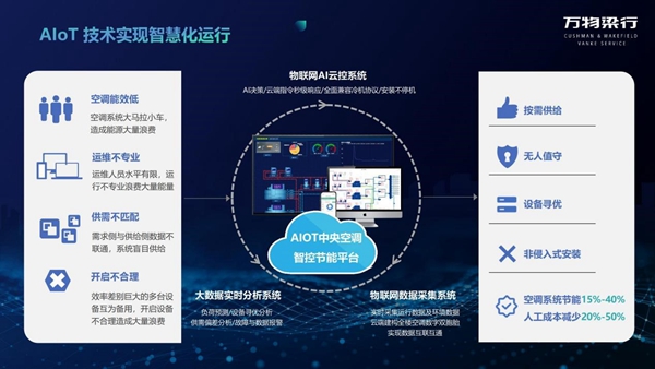 以能耗大项空调为例,通过物联网数据采集系统和大数据实时分析系统,叠加AIoT技术,来实现智慧化运行,解决了原有系统空调能效低、运维不专业、供需不匹配、开启不合理等一系列问题。